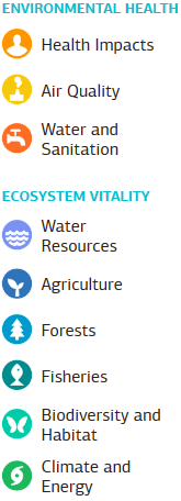 The Environmental Performance Index (EPI) ranks 178 countries on how well they perform on high-priority environmental issues in two broad policy areas: protection of human health from environmental harm and protection of ecosystems. Within these two policy objectives the EPI scores country performance in nine issue areas comprised of 20 indicators. Indicators in the EPI measure how close countries are to meeting internationally established targets or, in the absence of agreed-upon targets, how they compare to the range of observed countries.
