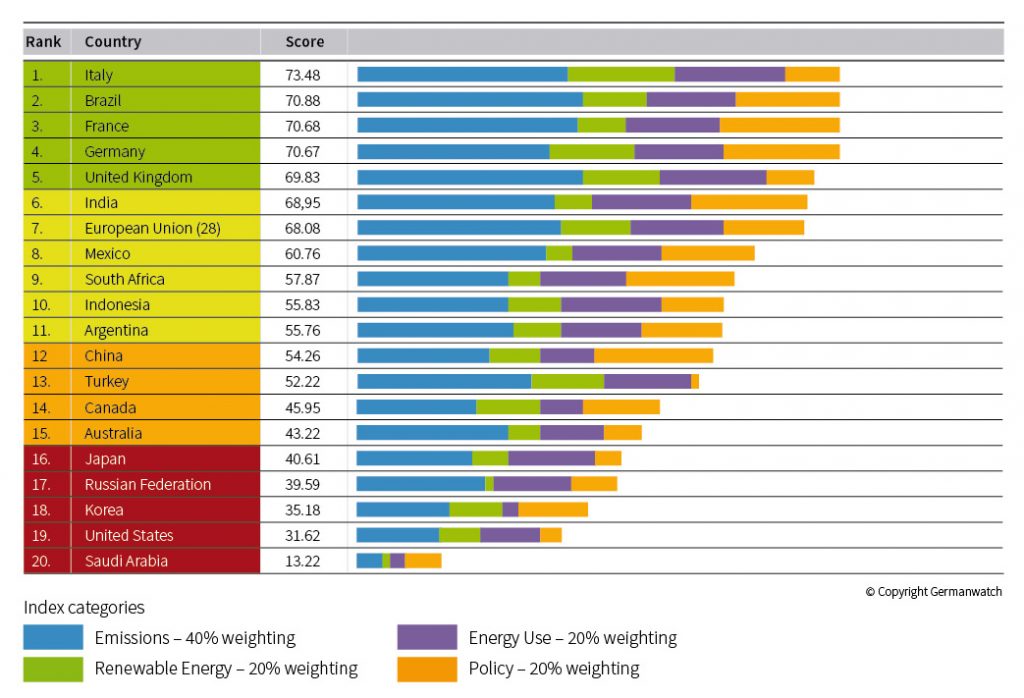 Italy, Brazil and France rank, albeit with some concessions, as best – while the US and Saudi Arabia can be found at the lower end. So far no country in the G20 is on track to meet the Paris climate goals.