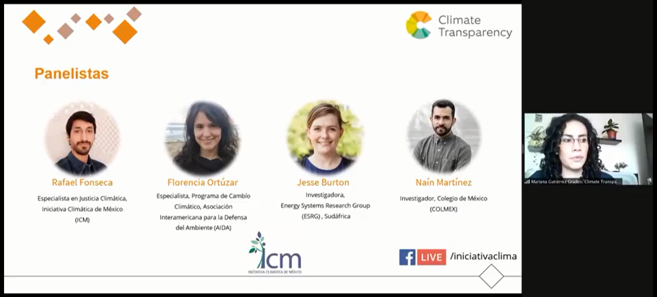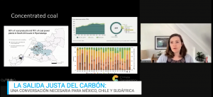 During the event, the current status and opportunities for a just transition in Mexico, Chile and South Africa were presented. Rafael Fonseca and Mariana Gutiérrez from ICM, Florencia Ortúzar from Interamerican Association for Environmental Defense (AIDA), Jesse Burton from Energy Systems Research Group (ESRG), and Naín Martínez from El Colegio de México attended the online seminar as speakers.