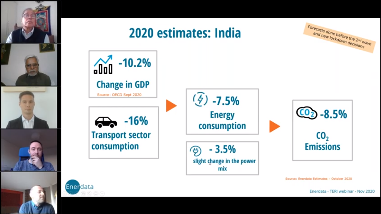 Secondly, Mr Pascal Charriau (Enerdata) focused on the question of what can be expected from the Indian Energy System and the level of emissions in 2020 and beyond. In September 2020, Enerdata estimated that the world economic growth will decline by -4.5%