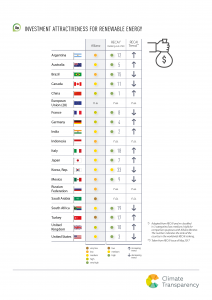Summarizes for all G20 countries Investment Attractiveness for Renewable Energy according to 1) Allianz Monitor; 2) RECAI Ranking and 3) RECAI Trend.