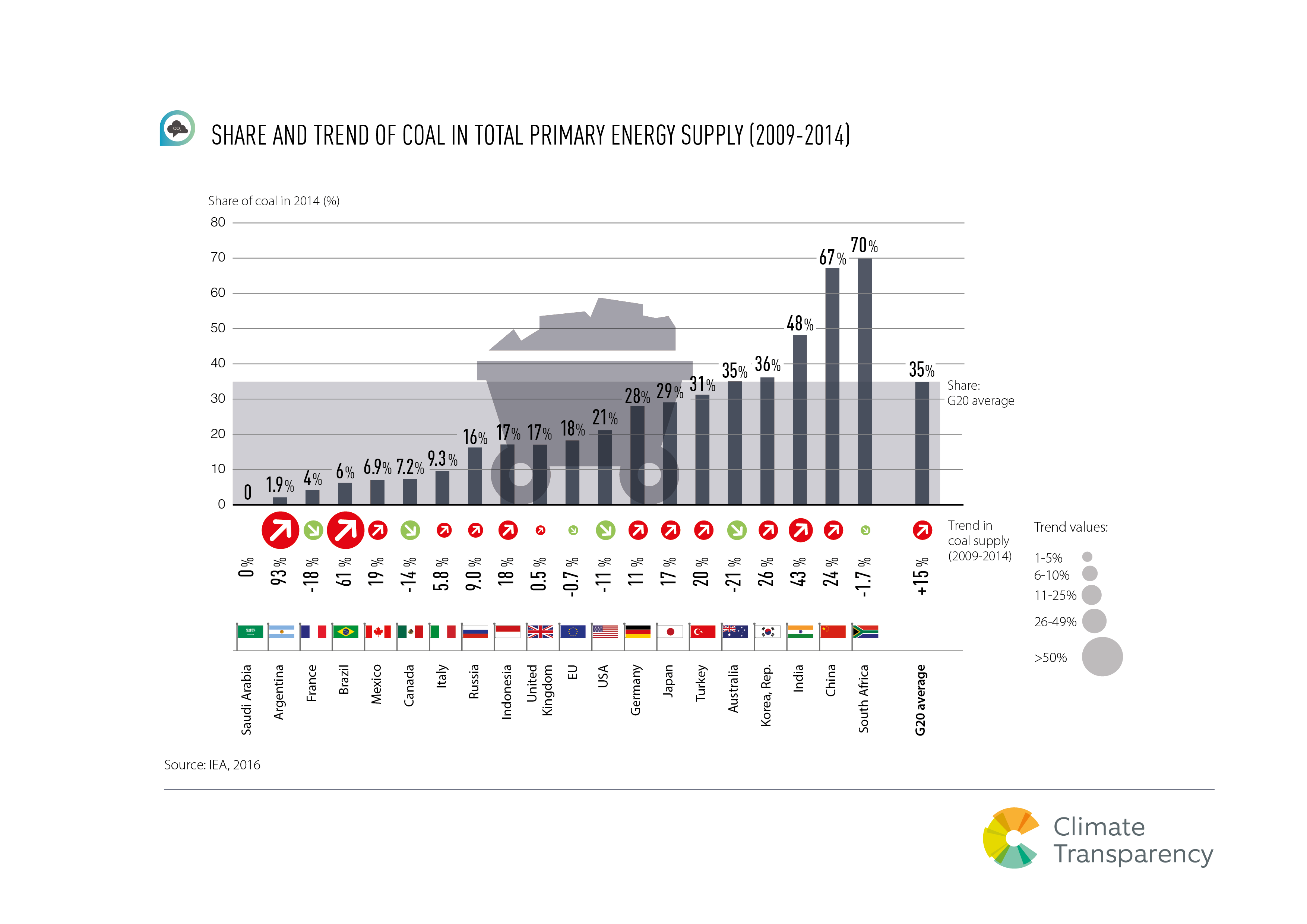 Compares for all G20 countries Share of coal in total primary energy supply for 2009 – 2014.