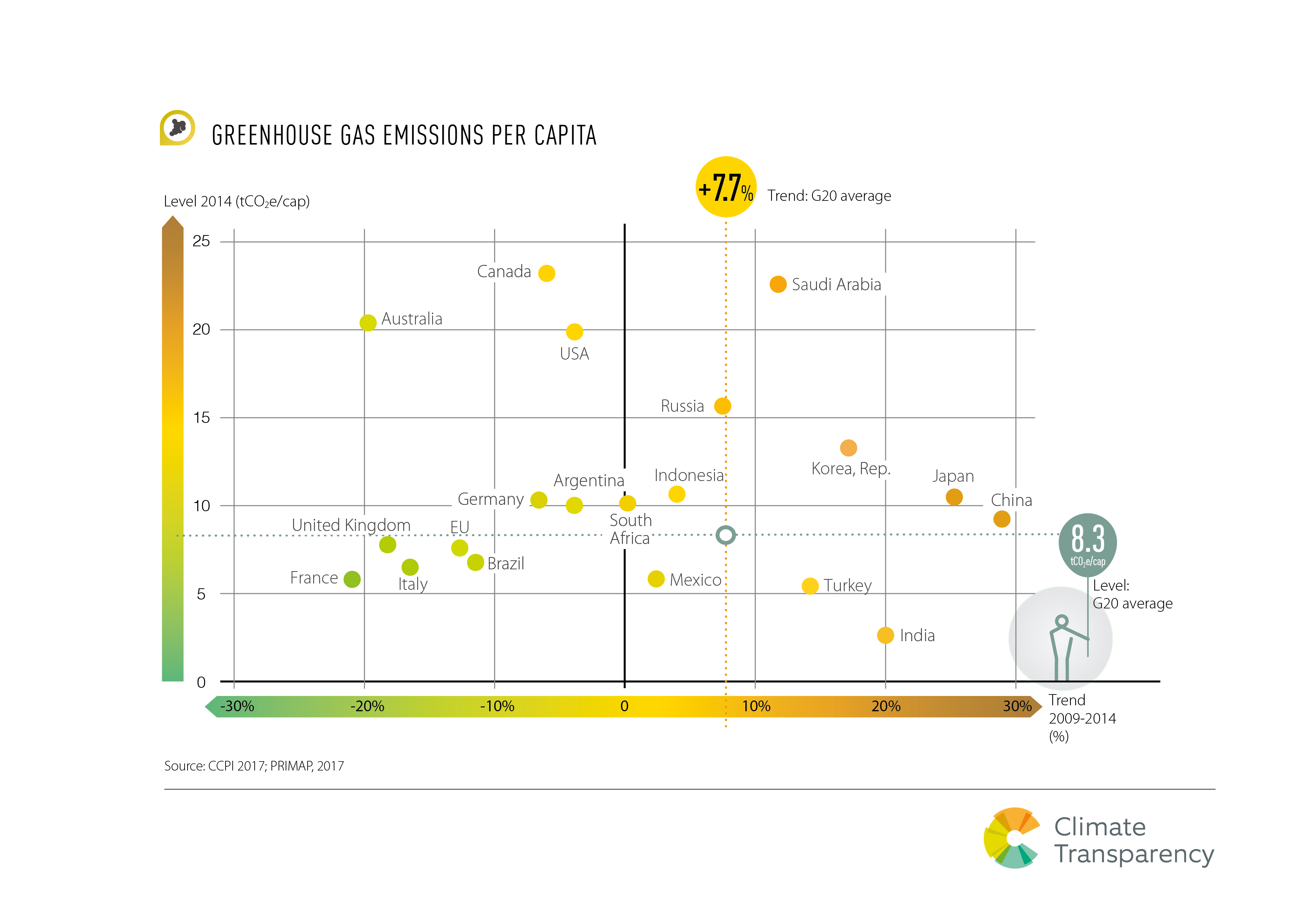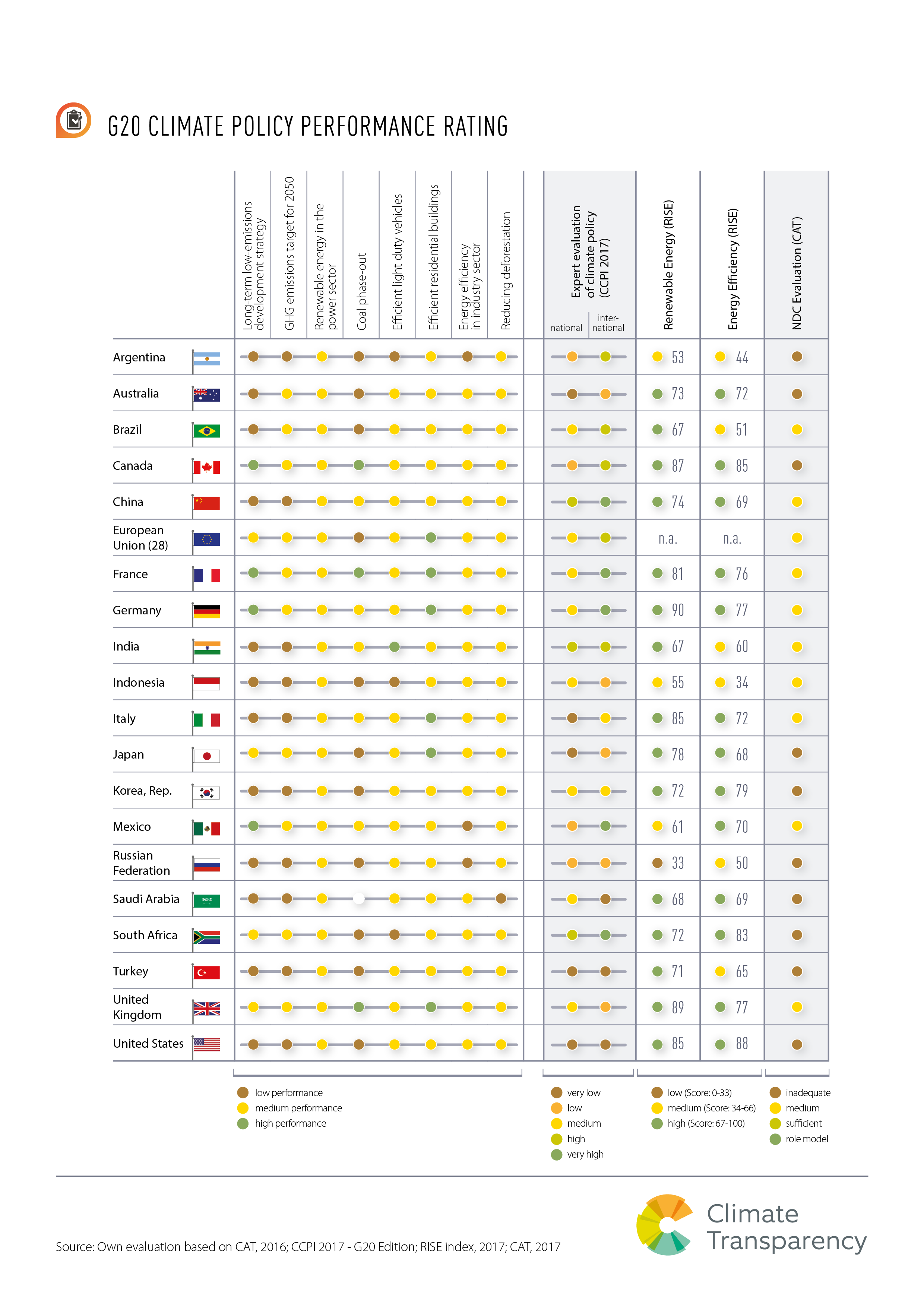 Sumarizes for all G20 countries 1) Expert Evaluation of Climate Policy (CCPI 2017); 2) Renewable Energy (RISE); 3) Energy Efficiency (RISE); 4) NDC Evaluation (CAT).