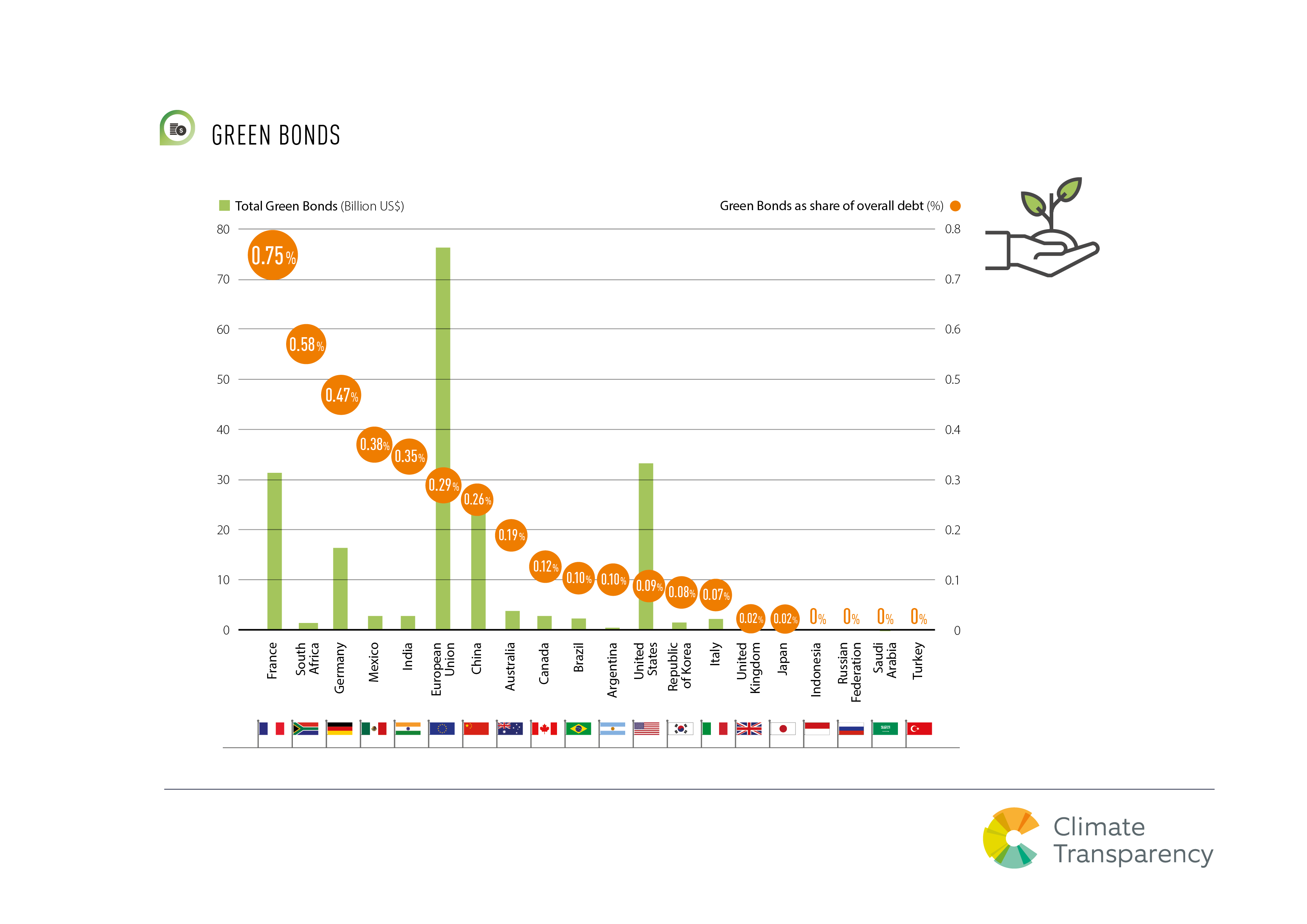 Total green bonds (billion USD) and Green Bonds as share of overall dept for all G20 countries