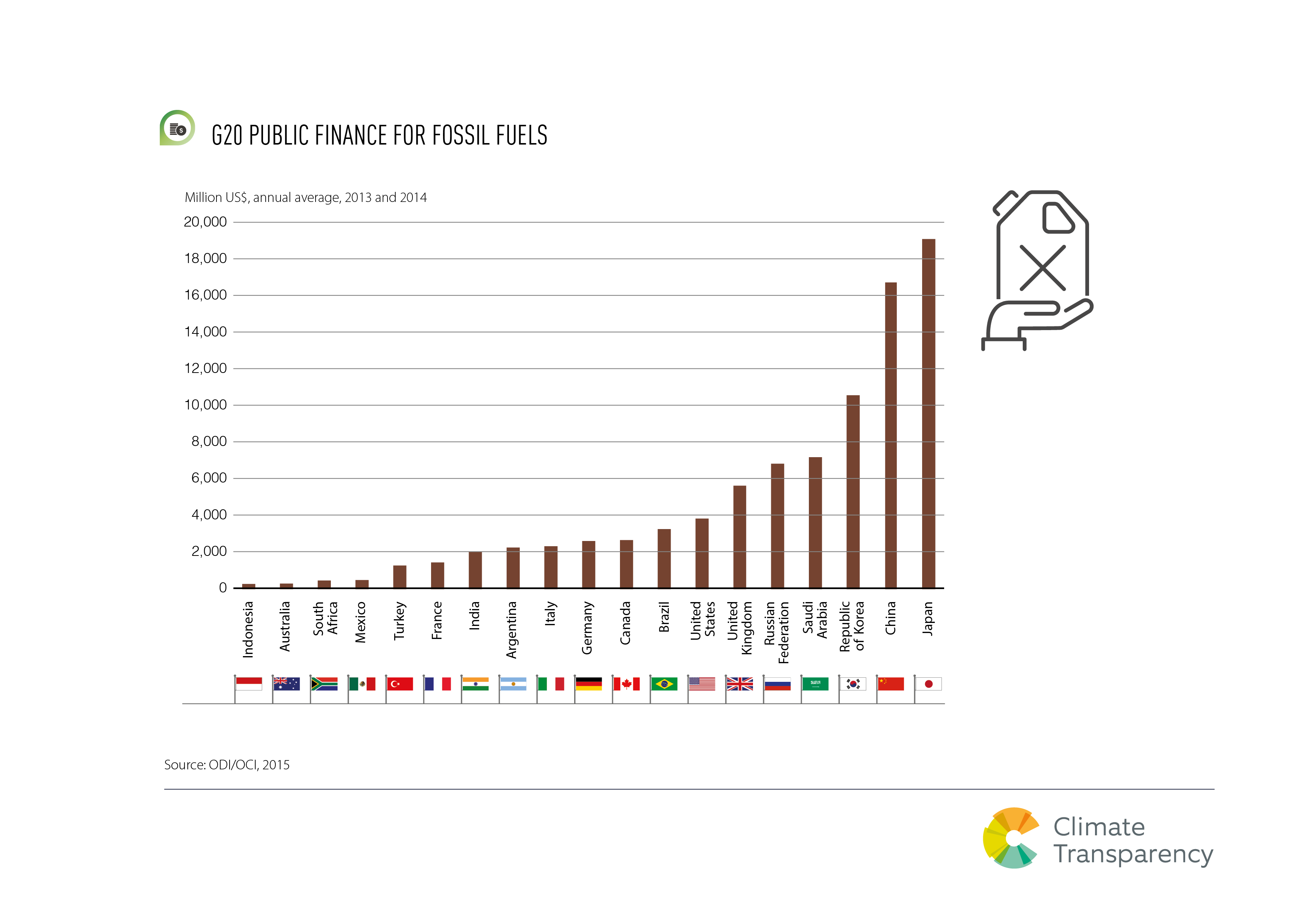 Compares for all G20 countries public finance for fossil fuels in million USD.
