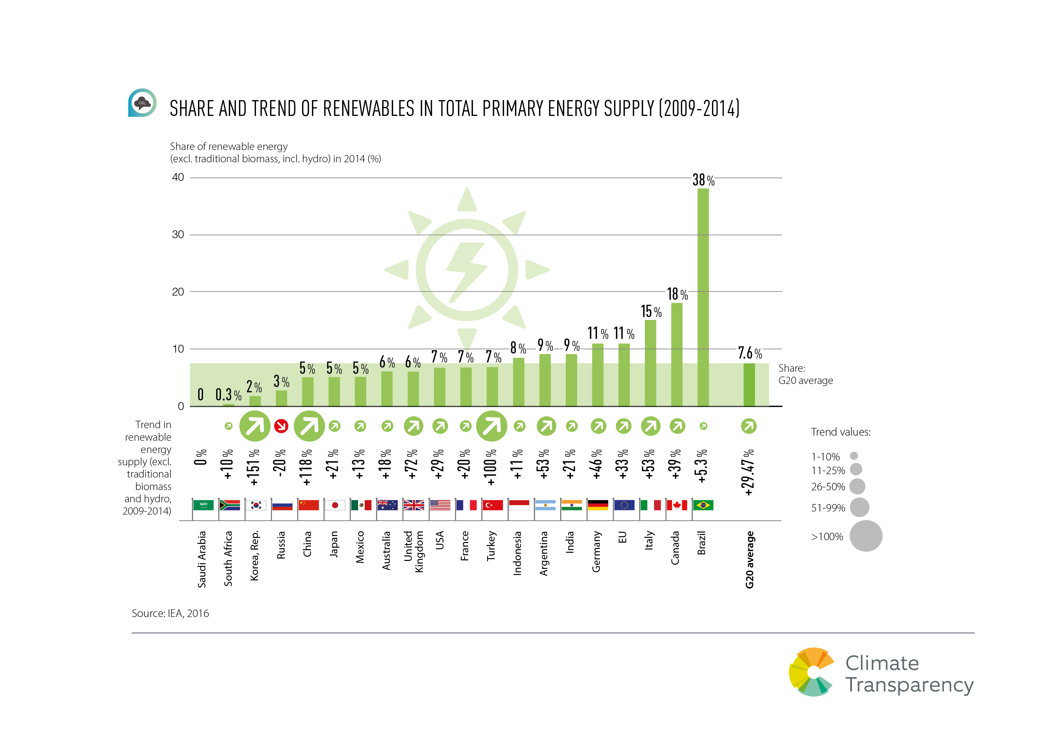 Compares for all G20 countries share of renewably energy (excl. traditional biomass, incl. hydro).