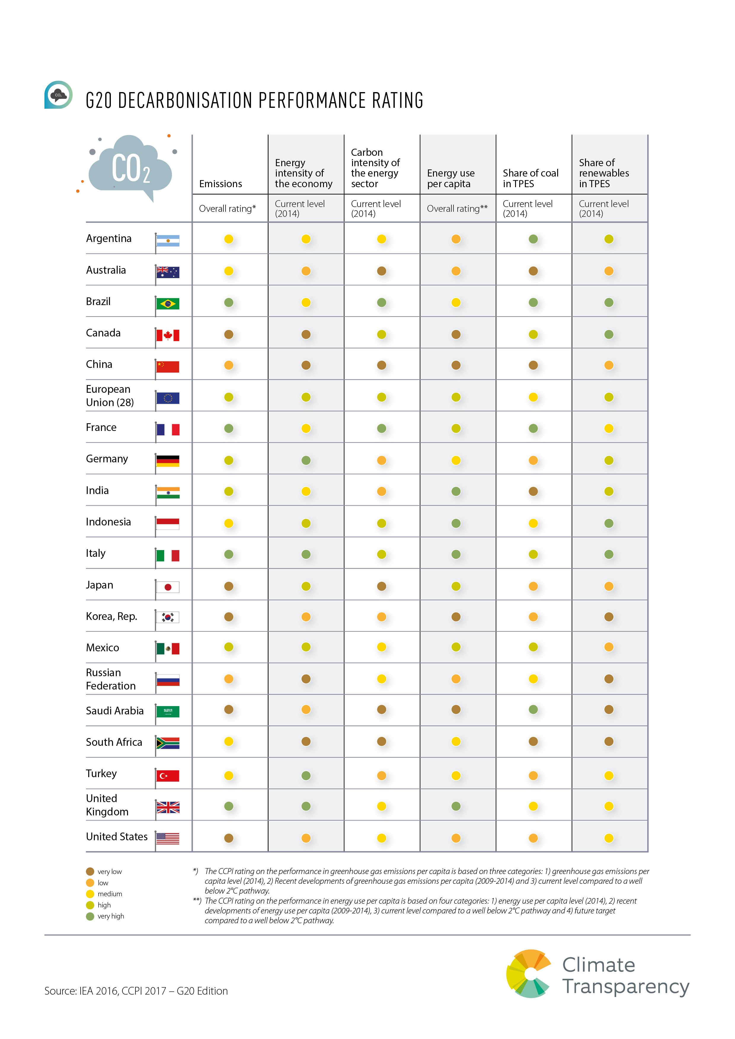Shows rating of all G20 countries in 1) Emissions; 2) Energy intensity of the economy; 3) Carbon intensity of the energy sector; 4) Energy use per capita; 5) Shares of coal in TPES and 6) Share of renewables in TPES.