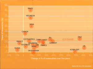 Many G20 countries have seen strong growth rates in renewable energy production. In some cases, the overall share of renewable energy in total primary energy supply is also rising, thus cutting fossil fuel use. The share of renewable energy is rising, in this way, in Germany, Italy, France, the UK, the EU, the United States, Canada and Japan.