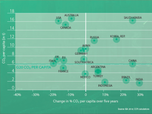 Half of G20 countries no longer show growth in energy-related CO2 emissions. Among countries with high per capita emissions, Saudi Arabia and Korea, Rep. are still increasing their emissions, whereas emissions are falling in the United States, Canada and Australia. Among countries with lower per capita emissions, India, China and Brazil all have high growth rates, while emissions are falling in the EU as a whole, and in some of its member states, in particular, such as France, Italy and the UK.