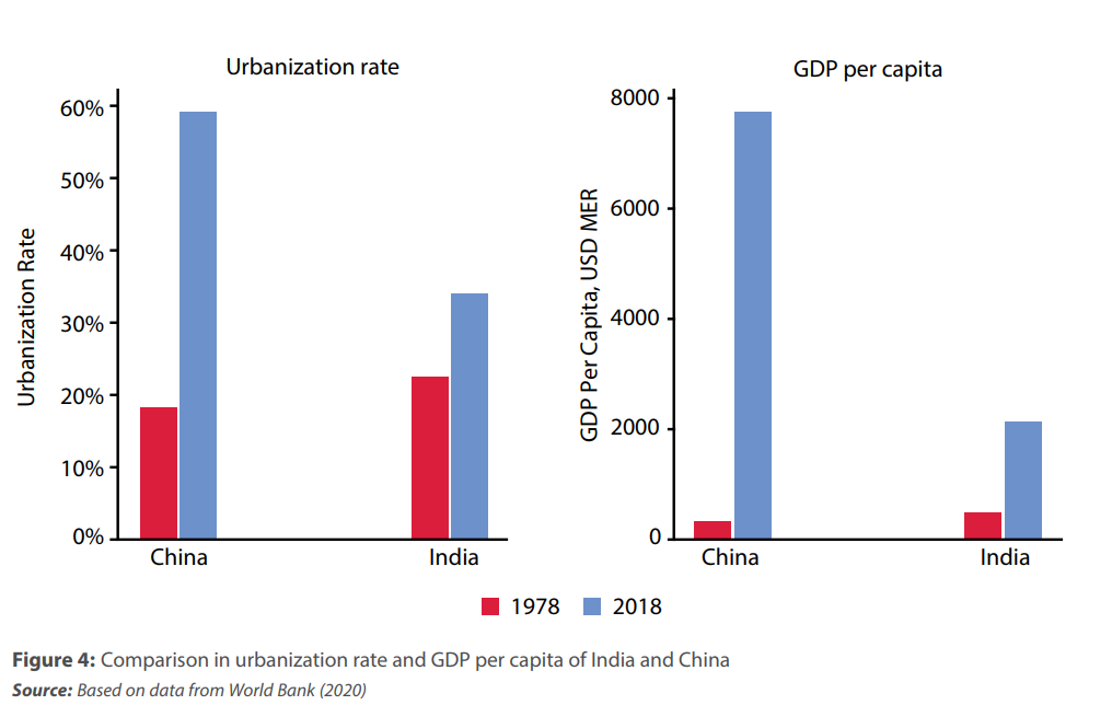 Both, India and China started reforming and opening up in around 1978, and since then China’s urbanization rate has been almost four times higher than the growth in India’s urbanization rate and has outperformed India in the per capita GDP growth by about five times.