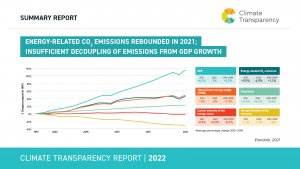 Not surprisingly, it has its effect on emissions as well – as a sufficient decoupling of emissions from economic activity has not happened yet. According to the Climate Transparency Report 2022, published on 20 October, total energy-related CO2 emissions dropped by 4.9% in 2020 only to increase again by 5.9% in 2021.