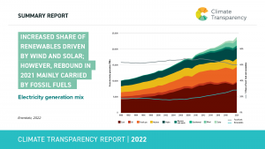 Yet, the strong increase of emissions demonstrates that renewables – though they have been expanded significantly over the last ten years – have not grown strong enough to balance the increase in electricity consumption. The increase of renewable energy in the power mix, in the last years has been mainly driven by wind and solar. However, the economic recovery in 2021 was mainly carried by fossil fuels leading to this strong rebound of emissions. The upward trend for share of renewables in the power sector slowed down during the pandemic, staying at 28% of the power mix in 2020 and 2021. At the same time, the downward trend of fossils also slowed down, staying at 60% of the electricity generation mix in 2020 and 2021.