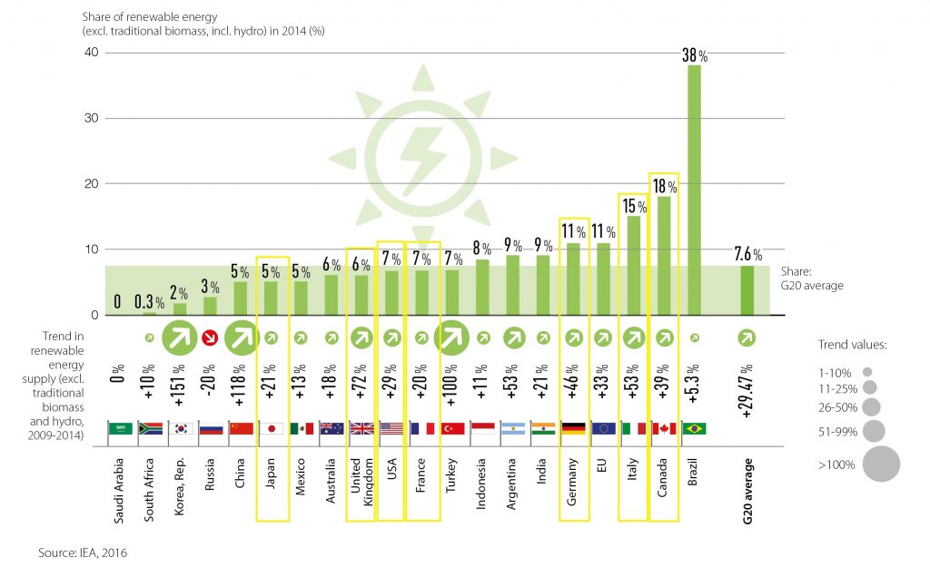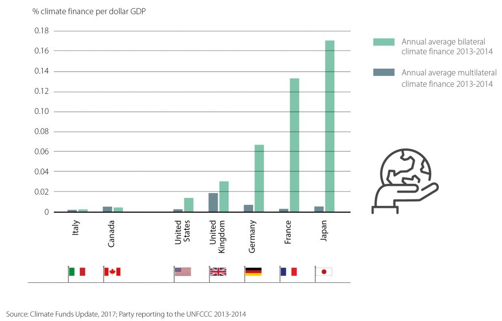 When Trump announced that the US would pull out of the Paris Agreement, shortly after last year’s G7 Summit, his justification was that the agreement was “very unfair, at the highest level, to the United States”. A comparison of how the G7 countries perform in their transition towards a low-carbon economy by the international partnership Climate Transparency however shows that this argument does not hold. In fact, according to the Brown to Green Report other G7 countries take more action and provide higher amounts of climate finance than the US.