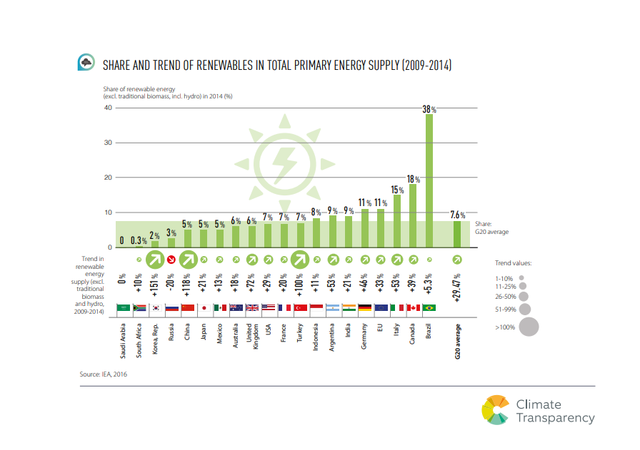 Share and Trend of Renewables in Total Energy Supply (2009 – 2014), 2017 Compares for all G20 countries share of renewably energy (excl. traditional biomass, incl. hydro). Share and Trend of Renewables in Total Energy Supply (2009 - 2014), 2017 (0,25 MB)